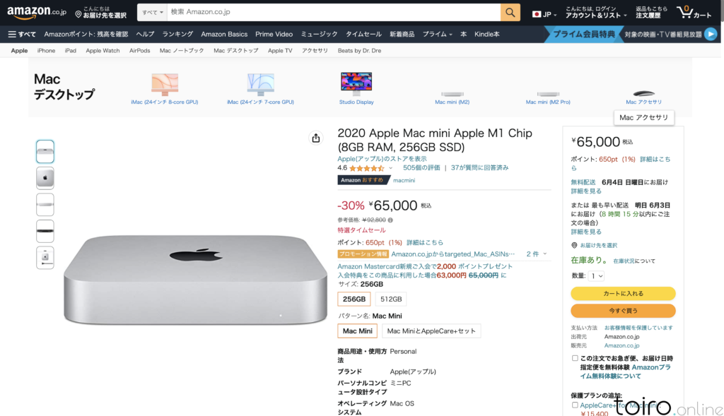 そんな破格な値段の一つとして、現在、M1搭載Mac miniがタイトルにもあるように、65,000円(税込)で販売中です!