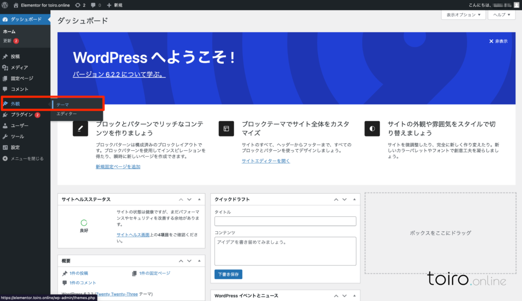 WodPressをインストールした直後の画面がこちら。ダッシュボードへログインしてElementorに適したWordPressテーマをインストールするところから始めます。