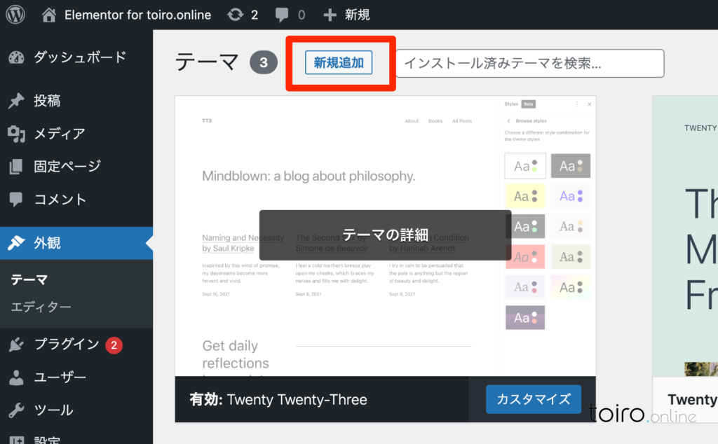 Elementorに適したテーマ「Hello Elementor」をインストールしたいので「新規追加」ボタンをクリックします。