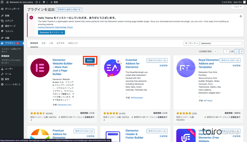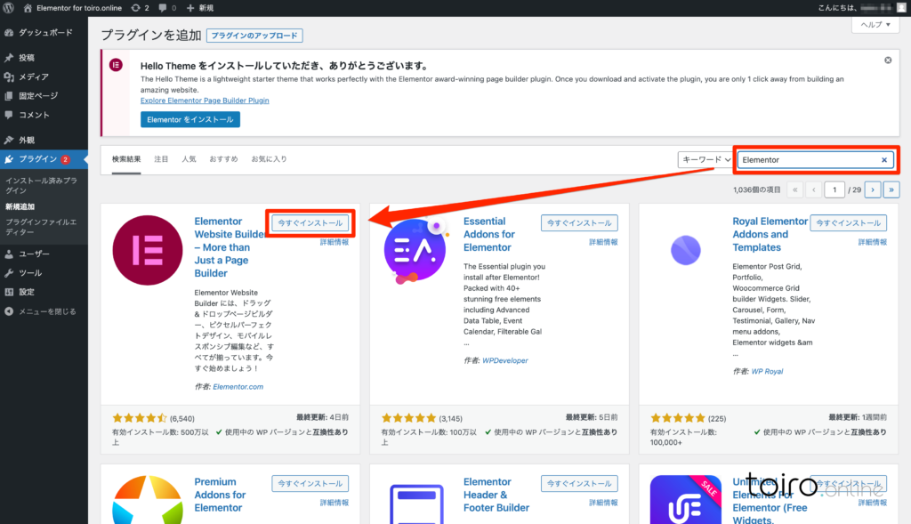 Elementorが推奨するテーマ全てが、同様のメッセージが表示されるとは限らないため、今回は、通常のWordPressプラグインのインストール方法で解説を進めます。