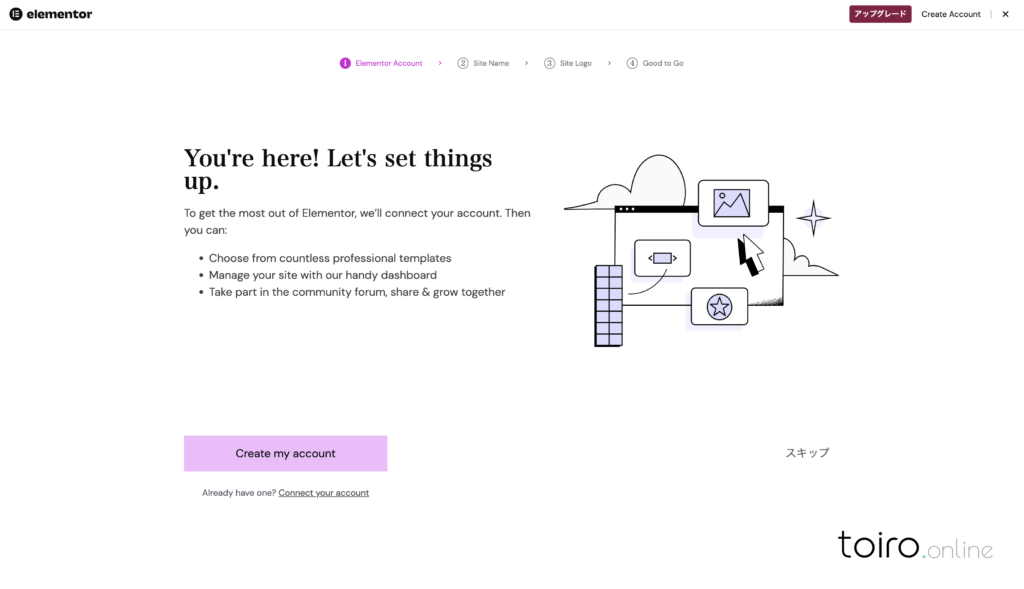 サポートが充実したElementorのアカウントを作成してWEBサイトを紐付ける