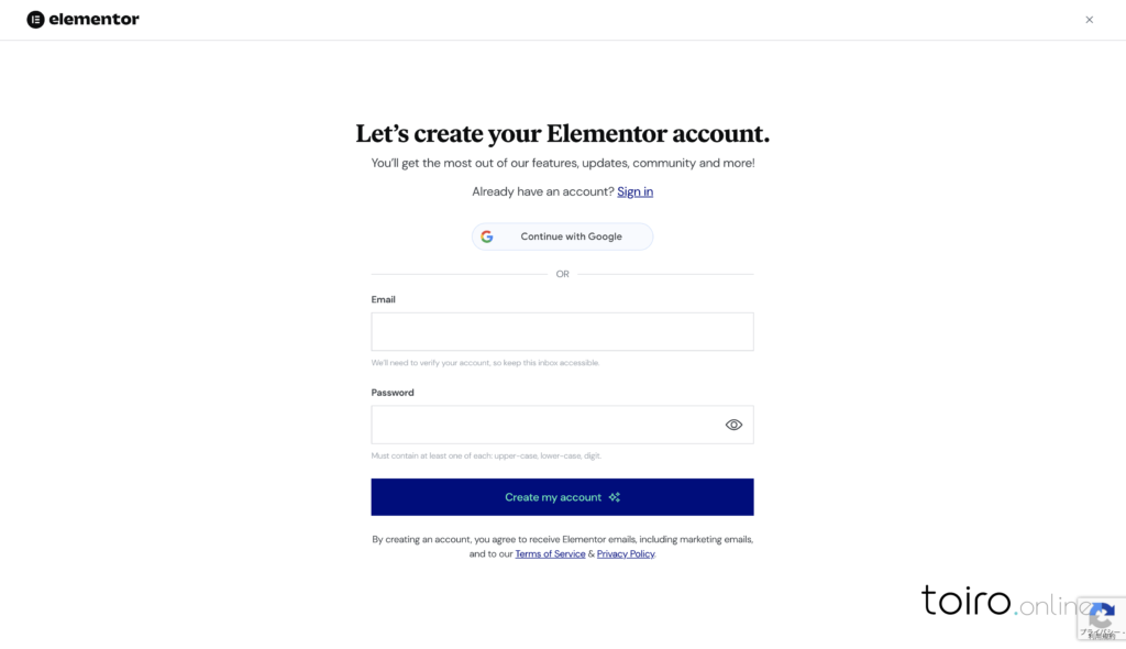 別タブでアカウント作成画面が表示されます。アカウントの作成方法はGoogleアカウントもしくはメールアドレスとパスワードで作成できます。