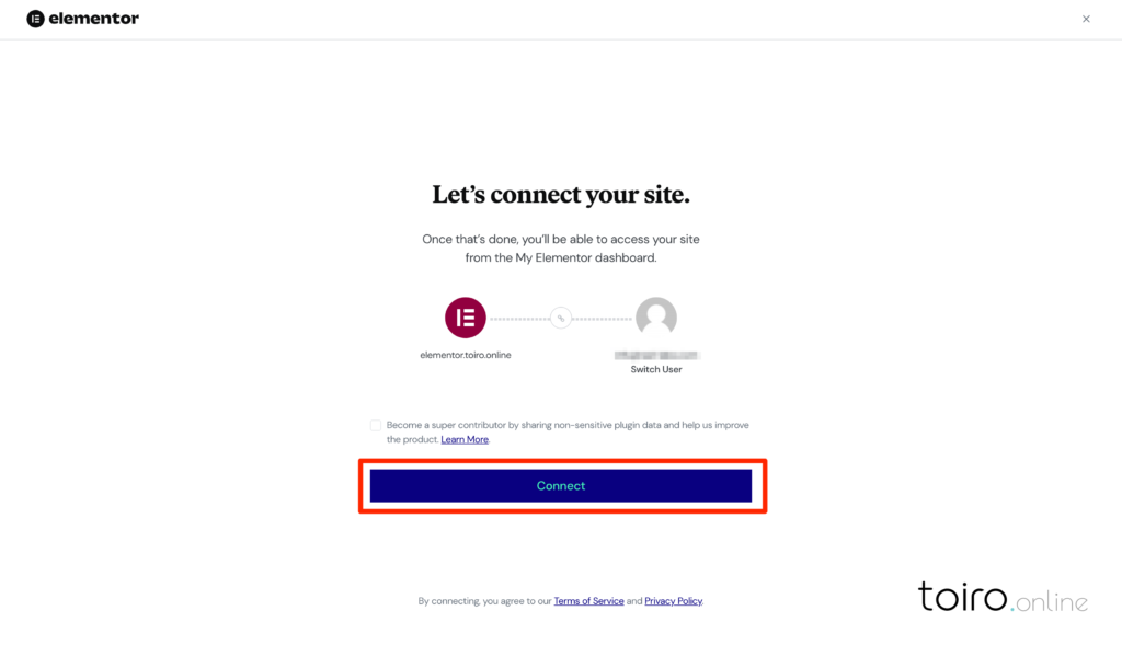 アカウント作成後、「Connect」ボタンをクリックすることで、ElementorのプラグインをインストールしたWEBサイトとアカウントを紐付けられます。