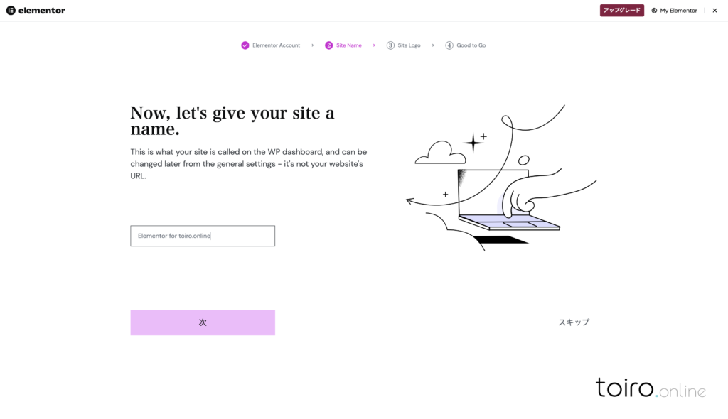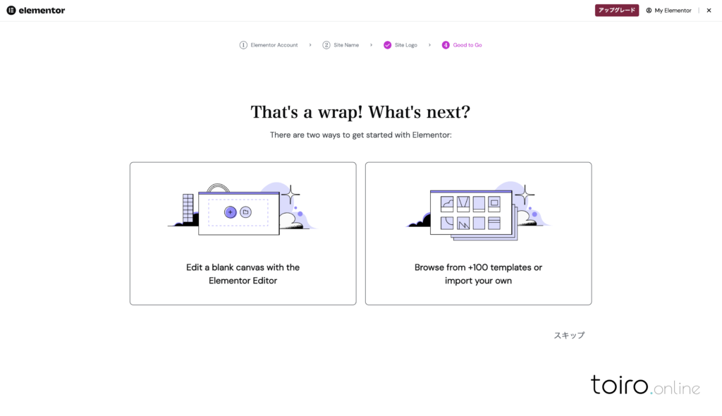 Connectで紐付けが完了すると、元のElementorの初期設定画面に戻ります。