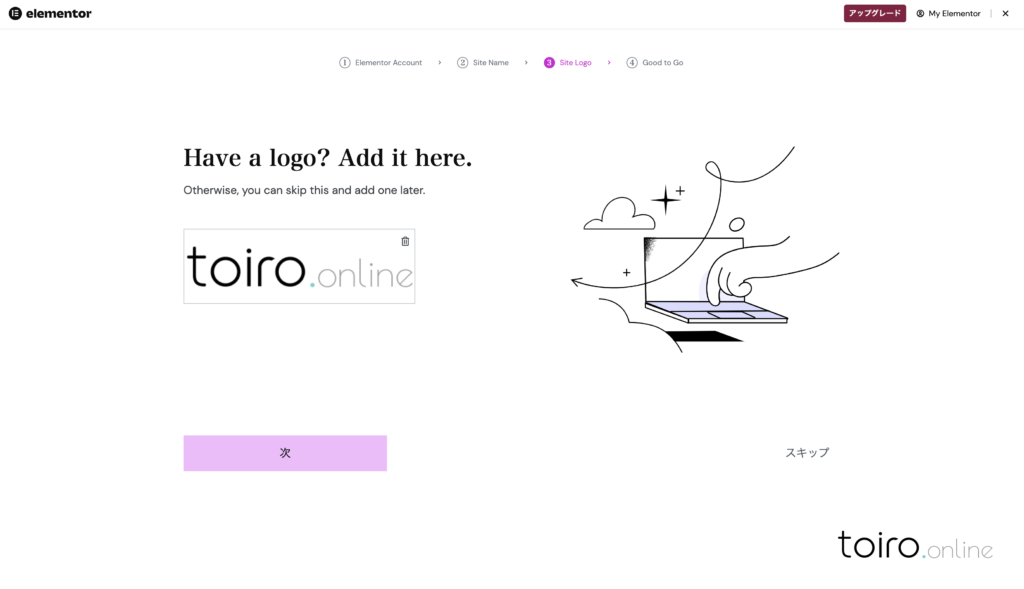 WEBサイトで使用するロゴを準備している場合は、ここでロゴ画像をアップロードします。ロゴ画像がない場合は、右下のスキップできます。