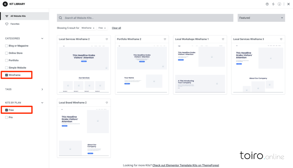 サイドメニューの「Wireframe」にチェックを入れて、無料版を使用する場合はKITS BY PLANより「Free」にチェックを入れると、無料で使えるワイヤーフレームをダウンロードして使用することができるようになります。