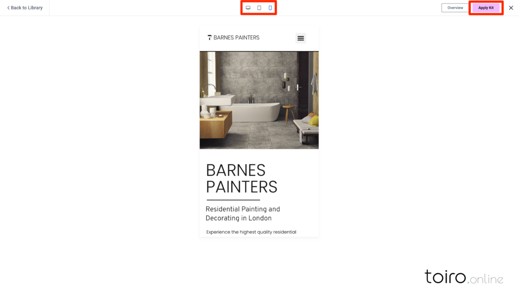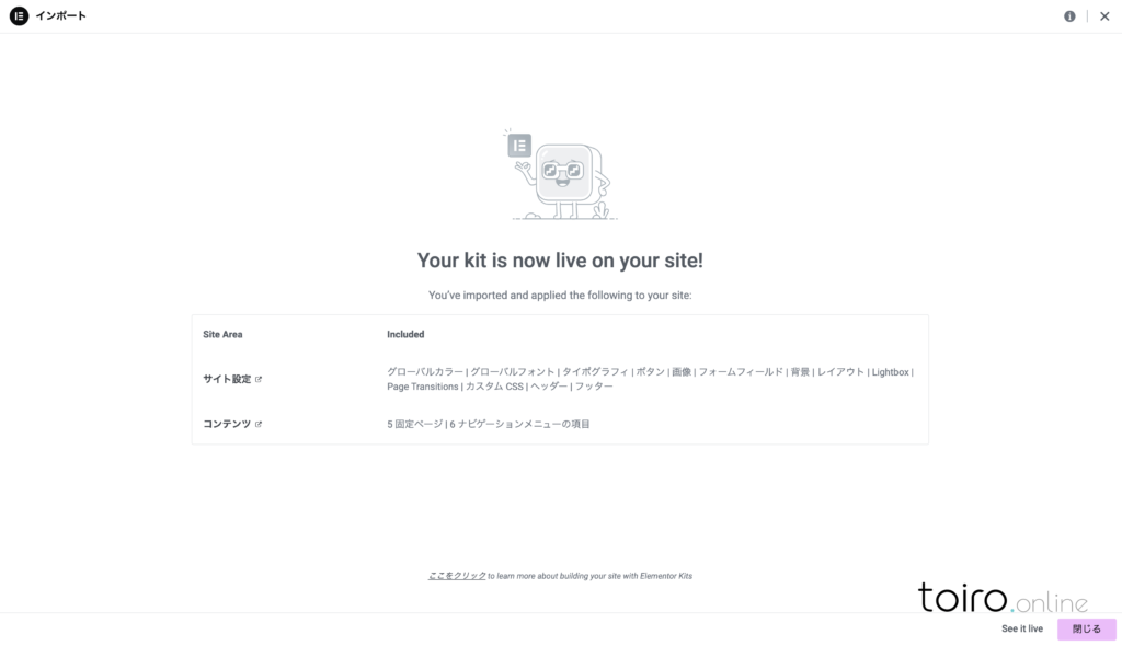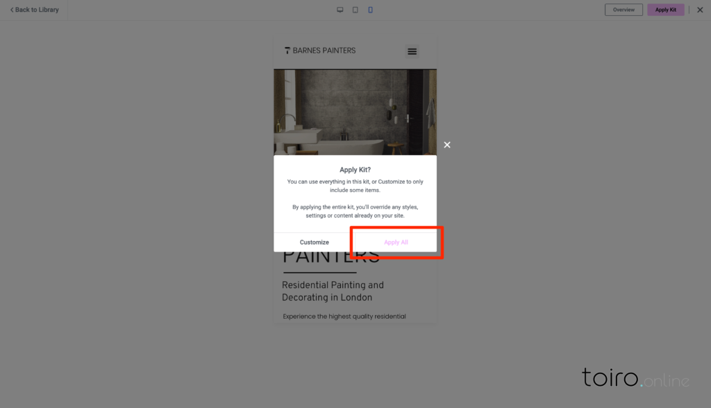 テンプレートを適用するには、右上の「Apply Kit」ボタンをクリックします。