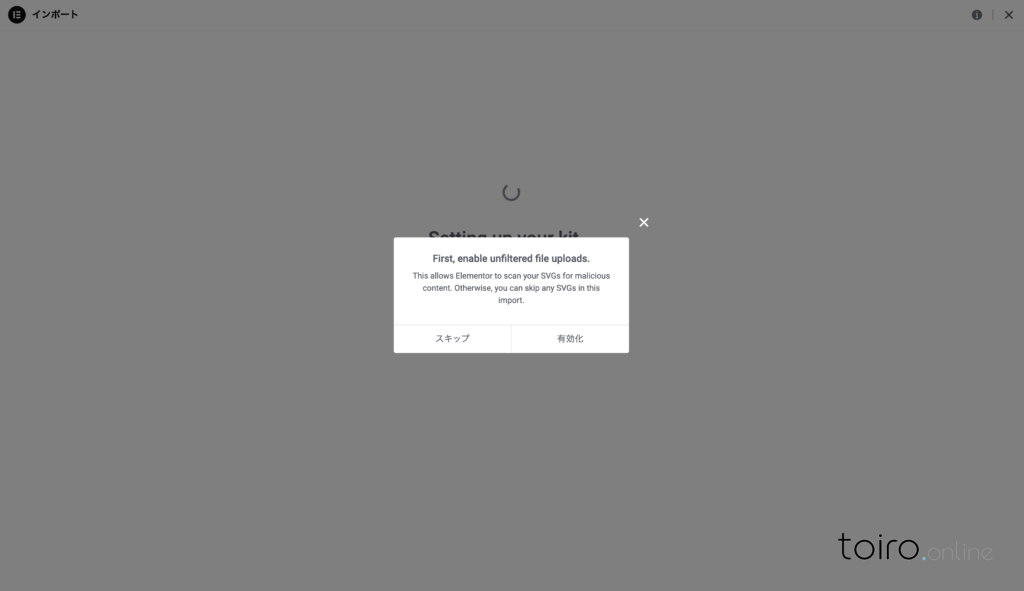 Elementorのプラグインを有効化すると、自動的にElementorの初期設定画面へ遷移します。Elementorは海外製のWordPressプラグインであるため、基本的には英語で案内され、言語変更はありません。