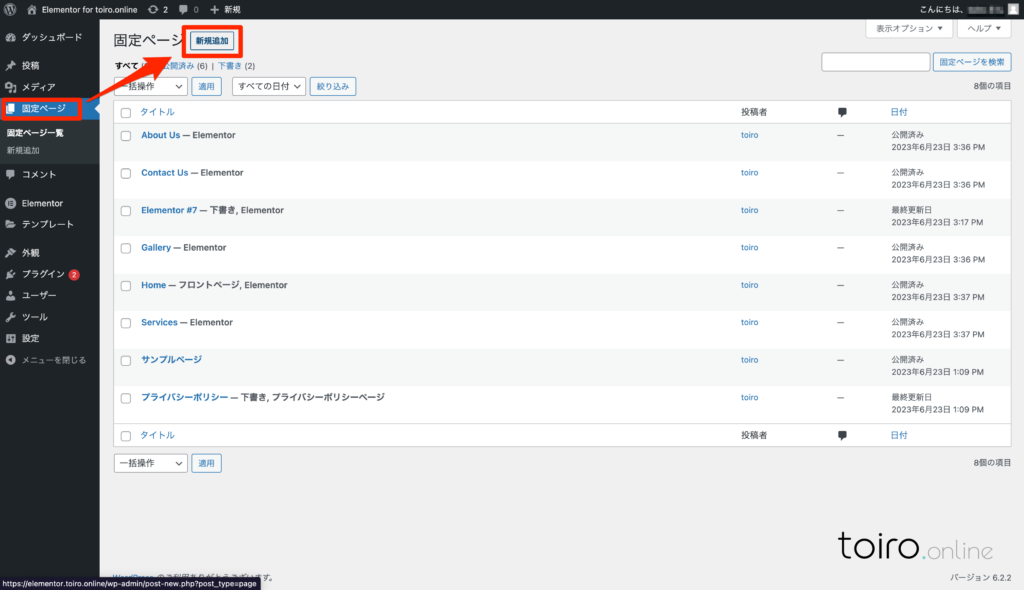 WordPressのダッシュボードよりサイドメニューにある「固定ページ」をクリック。「新規追加」よりTOPページなどの固定ページを新規作成することができます。