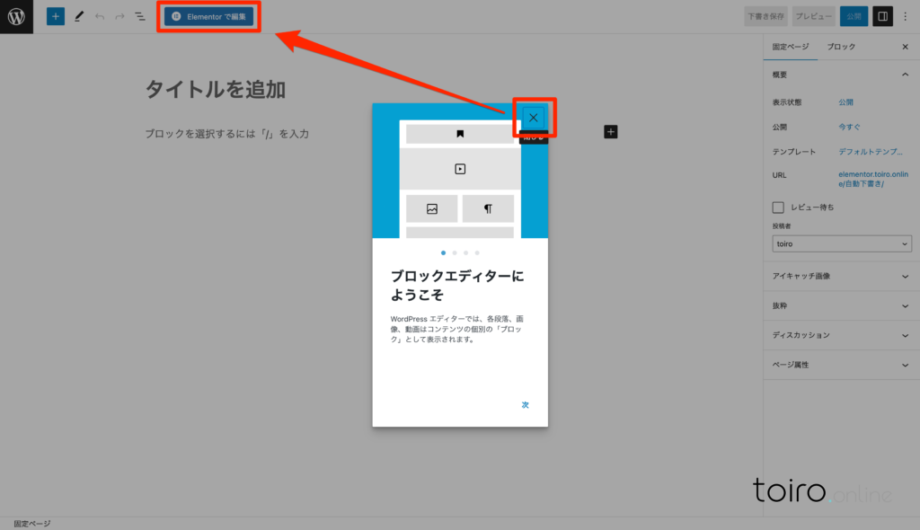 初めて、WordPressの編集画面を開いた場合、WordPressのブロックエディタについてのナビが表示されますが、右上の閉じるボタンをクリックして、上部にある「Elementorで編集」ボタンをクリックします。