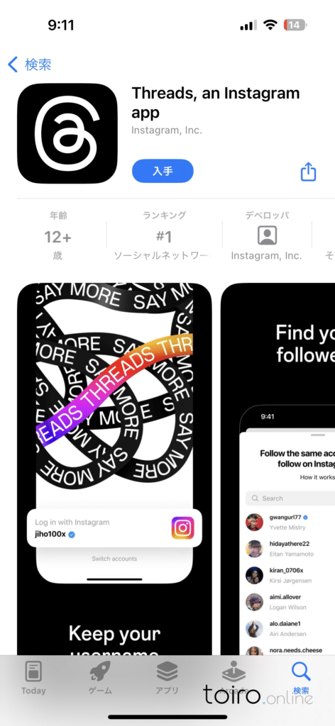 iPhoneでApp Storeをタップして「スレッズ」と検索するか、以下リンクより配布ページにアクセスして入手をタップします。