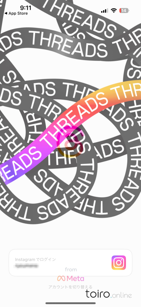 Threads(スレッズ)アプリを初回起動すると、Threads(スレッズ)を利用するためのInstagramでログインすることが求められます。今回は、toiro.onlineのアカウントでThreads(スレッズ)を利用したいため、Instagramのアカウント作成をするところから始めます。