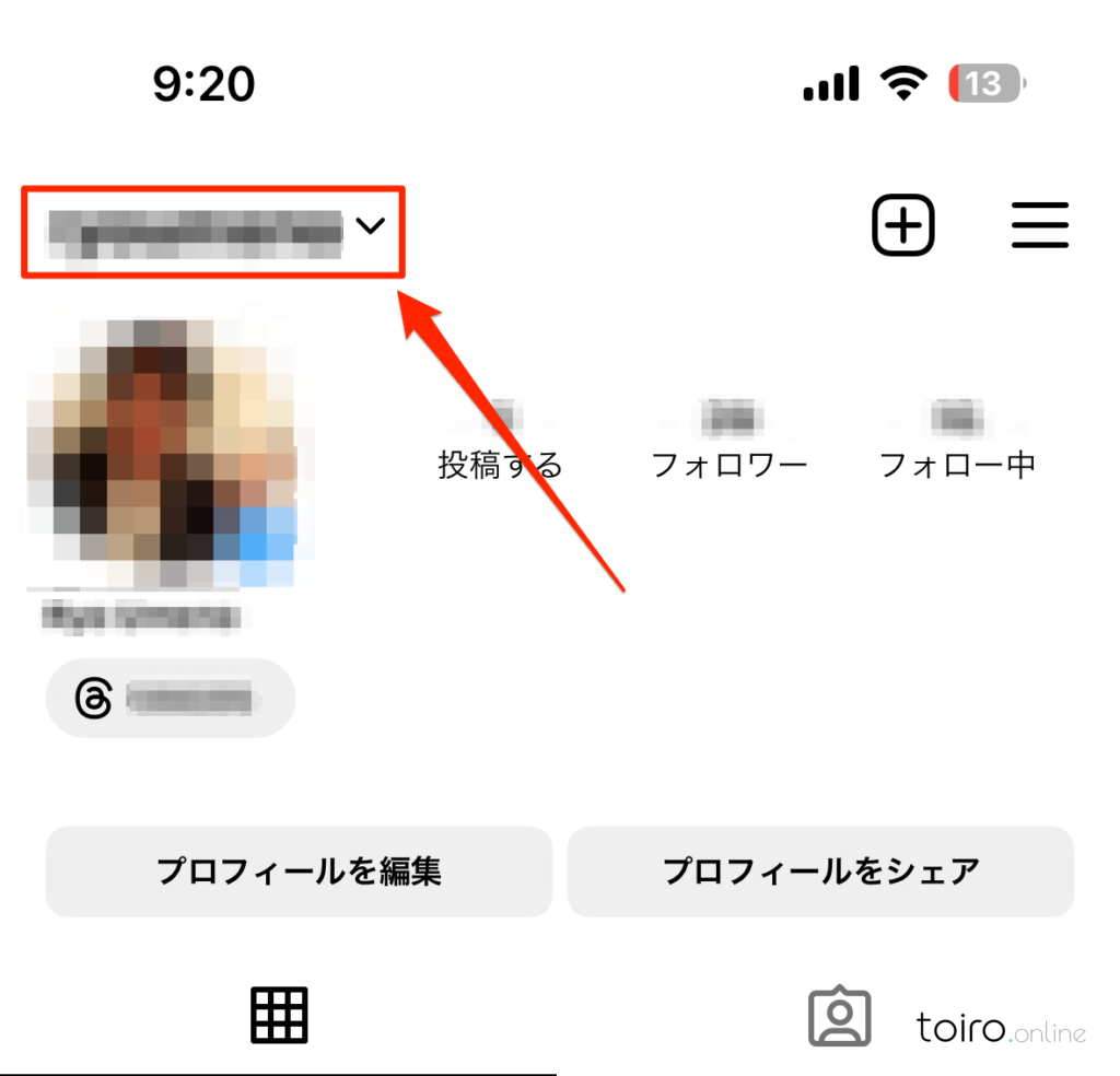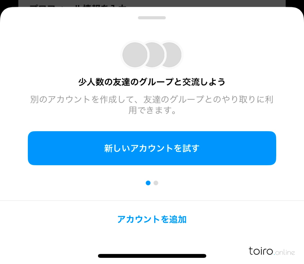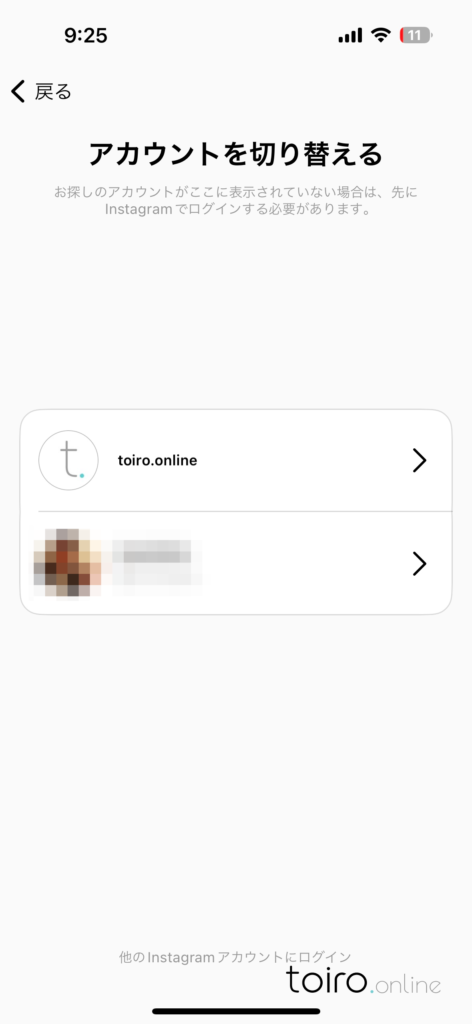 改めてThreads(スレッズ)より「アカウント切り替え」をタップすると、先程、Instagramで作成したtoiro.onlineのアカウントがThreads(スレッズ)のアプリからも確認できるようになりました。