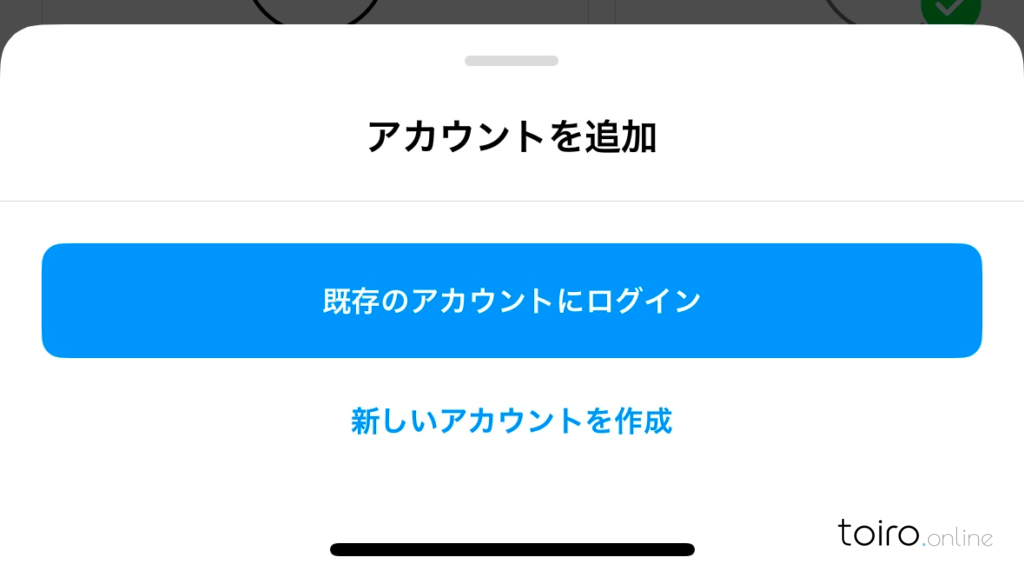「既存のアカウントにログイン」もしくは「新しいアカウントを作成」の選択肢が表示されました。今回、toiro.onlineのアカウントを新たに作成するため、「新しいアカウントを作成」とタップして進みます。