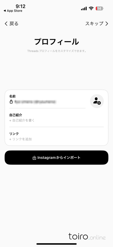 プロフィールの設定画面では、名前の部分にInstagramのアカウント情報が引き継がれています。自己紹介やリンク、プロフィールに設定するアイコンなどを個別に設定することができますが、「Instagramからインポート」ボタンをタップすると、自動的に各項目にセットされました。