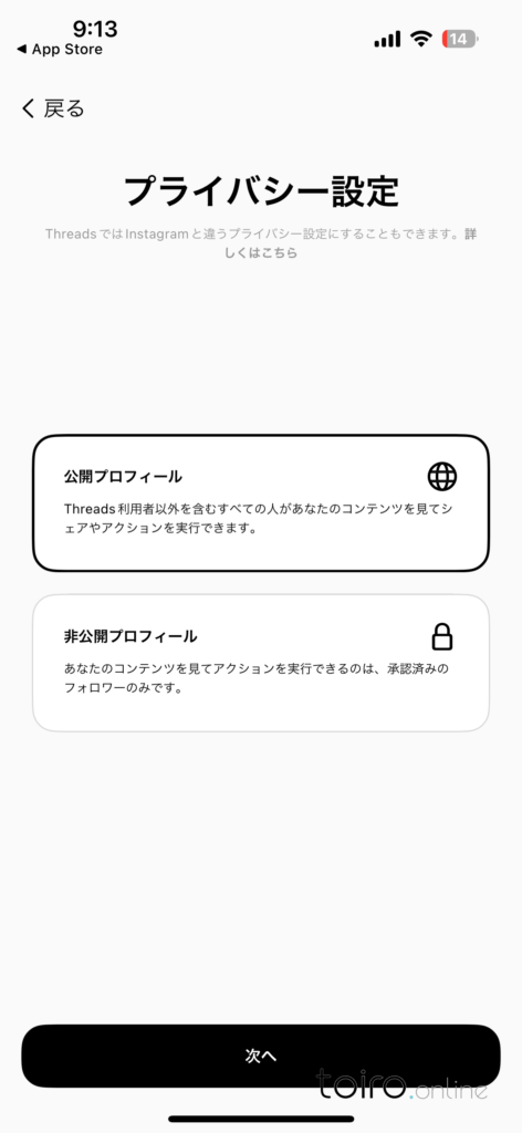 Threads(スレッズ)はInstagramとは異なるプライバシー設定が行われるようです。プロフィールを公開するか否かについて「公開プロフィール」もしくは「非公開プロフィール」のどちらかをタップして「次へ」ボタンをタップします。