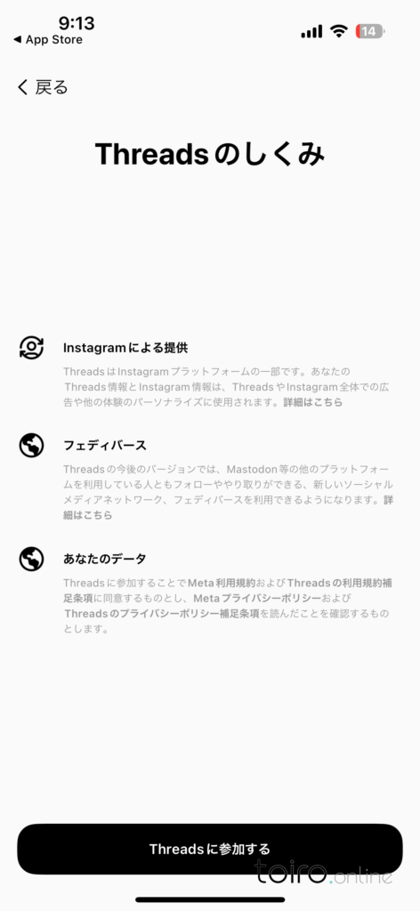 Threads(スレッズ)はMetaプライバシーポリシーやThreads(スレッズ)のプライバシー補足条項などが設けられているので確認した上で「Threadsに参加する」ボタンをタップして、Threads(スレッズ)への初回ログイン設定が完了します。